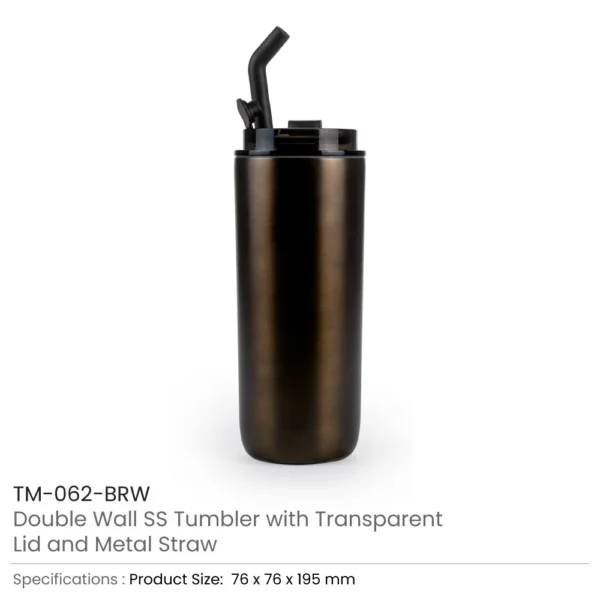 Double Wall SS Tumbler with Transparent Lid and Metal Straw – 500ml