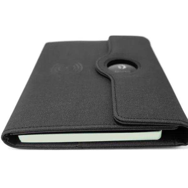 Multi-function A5 portfolio notebook with an integrated 8,000 mAh powerbank and 15W wireless charging pad. Finished in premium polyester fabric with PU reinforcement, it features a magnetic closure, round logo branding plate, foldable phone holder, 3 card slots, phone pocket, and extra pocket — ideal for executives and corporate gifting.